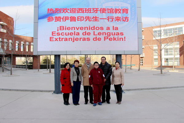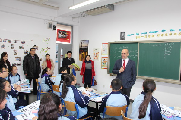伊鲁印首先感谢林校长一行的热情接待,表示北外附校作为由西班牙政府及使馆教育处支持的政府项目学校,是全国在基础教育阶段开设西班牙语的中小学校之一(全国仅二所,另一所在济南),在北京市尚属首家。自上任以来,伊鲁印对北外附校的西语教学就非常关注,上月附校常务副校长王彤博士到访使馆教育处,对北外附校的初步介绍给他留下深刻印象,此次实地考察,希望能够进一步了解附校西语教学的实际情况,从而帮助附校更多学生学好西班牙语,感受地道的西班牙文化。