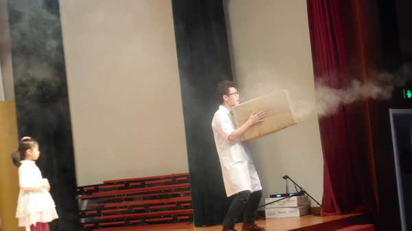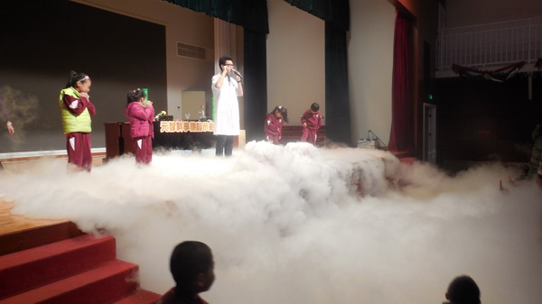 活动中,维尼老师和丫丫老师一共展示了三项实验:一是用简单的道具展现了空间越小压力越大的空间压力原理;二是用吹风机使气球在空中漂浮,证明了伯努利定律;三是通过“干冰世界”的实验,即干冰遇到热水瞬间蒸发,诠释CO2遇水产生“烟雾”的原理,让学生在“仙境”般的视觉体验中体会到了科学原理。