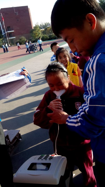 学生在做肺活量测试