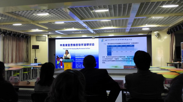 随后的教学实践展示课向大家更具有针对性地展示了思维图在语文、数学、外语和科学四个学科课堂教学中的具体操作和运用。语文课借助了复杂思维图进行主要内容回顾和课文重难点的突破。数学课老师则借助双泡泡图对分数的四则混合运算进行了讲解。而美国朗登小学的4位教师根据自己的课堂教学对8种思维导图的运用所进行的详细介绍和作品展示,也使在座教师对思维图有了更加直观系统的认识和理解,大家对运用思维图教学有了更深的体会。