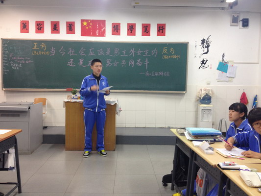 上周,高二年级(5)班的同学们利用班会课开展了一场别开生面的辩论会。由四个男生四个女生分别组成的强大的辩手团队就“当今社会应该是男主外女主内还是男女共同奋斗”的主题,在充足的材料数据、每个人心中的坚定想法和毫不退让的执着精神的支持下激烈辩论,为自己所支持的观点呼出最强音。