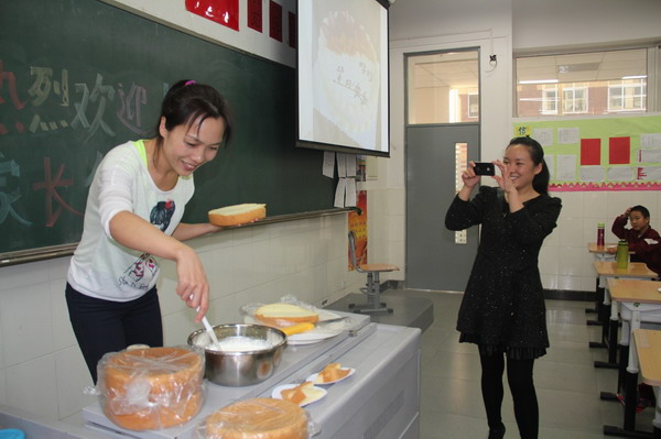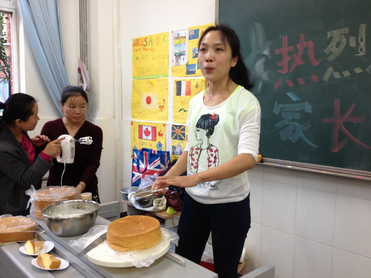 家长亲自示范制作蛋糕