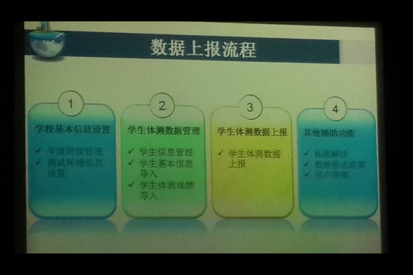 《国家体制健康测试》上报软件培训。学习了《国家体制健康测试》的特点、重要性,使老师、学校从思想上重视此测试。学习上报步骤,主要分为以下几步:在线上报、逐级上报审核、使用统一的学校代码、使用同一的学籍号、使用新标准。会议要求,学校必须高度重视《国家体制健康测试》,时间紧,任务重,各个部门要默契配合。