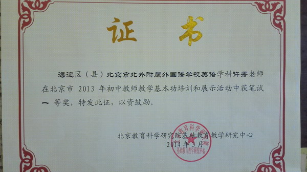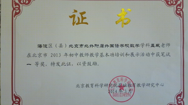 在北京市2013年初中教师教学基本功培训和展示活动中,我校初中数学教师孟威和英语教师许秀荣获笔试一等奖。
