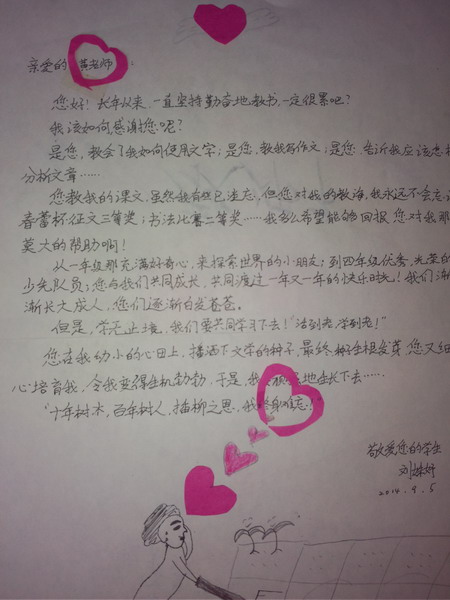 年级组提前布置了学生制作教师节贺卡,让学生知道制作贺卡大体可以分为几个步骤:设计内容,搜集材料,撰写文字,动手制作,敬献贺卡……让学生在制作贺卡的过程中更深一层次地理解老师的付出,懂得应该如何尊重老师的劳动成果。