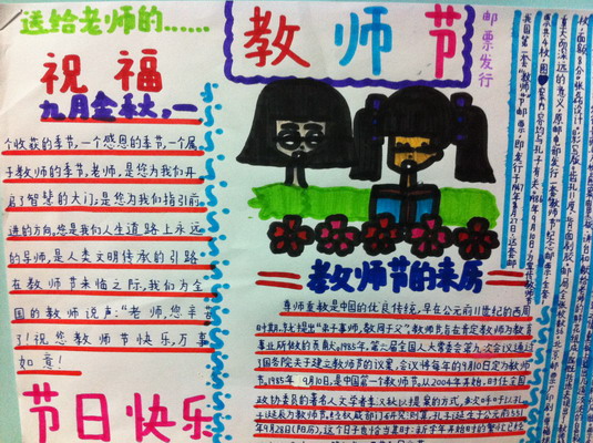 语文组展出了制作精美的教师节手抄报。学生们通过上网、查阅图书报刊等方法搜集所需要的资料,从主题选定到排版设计,从构画板头到写美术字,从板面美化到色彩搭配都认认真真,一丝不苟。同学们津津有味地欣赏着精美小报,那娟秀的字体、规范的格式、明丽的版面,都给他们留下了深刻的印象,不时能听见学生们啧啧的称赞声。