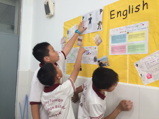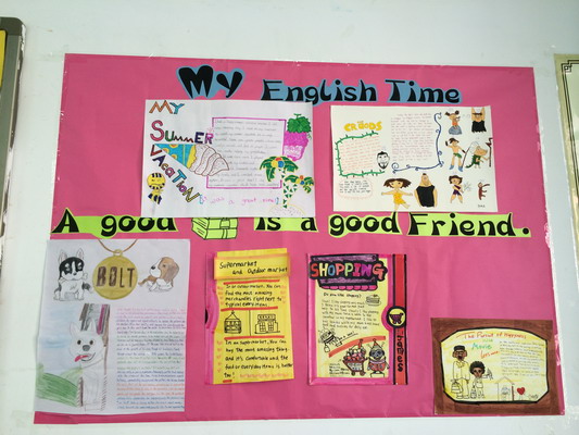 英语组暑假作业要求学生观看一部英文电影或英文书,并根据电影和书籍内容制作一份手抄报。各班在教室的英语角都展示了优秀的手绘作品,引得每位学生驻足观摩。