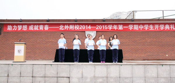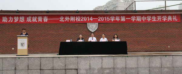 9月1日,我校中学生开学典礼在学校操场举行。北京外国语大学校长助理、我校校长林卫民,我校常务副校长王彤,副校长、副书记高雁鸣,副校长于苒,家长代表崔雪梅出席典礼。王校长主持本次典礼。