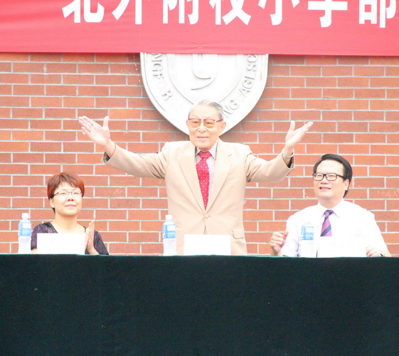 六年级(6)班张瑾姝同学和五年级(3)班王易亁同学两位小主持人邀请出我校90岁高龄的大朋友陈琳教授。他曾给予附校的英语教育以无数的启迪,始终关心着附校孩子们的成长,孩子们热情地呼喊着“陈琳爷爷,”现场气氛异常热烈、温暖。精神矍铄的陈琳教授依旧充满朝气,底气十足,表达了见到孩子们的喜悦,并对孩子们给予厚望,也提出了希望附校学生能将“兼容并蓄,博学笃行”的北外精神代代相传。孩子们认真聆听,频频点头,牢记在心。