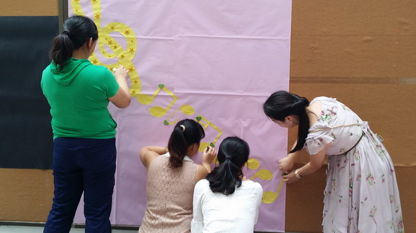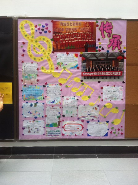 8月29日音乐组接到题目为“传承北外精神,争做阳光附校人”的环境布置通知,马上积极的设计并着手制作了宣传板。音乐艺术的魅力,能孕育出高雅的审美情趣,可以使生命焕发出耀眼的光彩。优美动听的旋律,充满生机的节奏,丰满浑厚的和声,绚丽多彩的音色,无一不洋溢着生命的激情和活力。音乐组力争“传艺术灵动之魂,承附校文明之风”,不断发扬北外精神,不断培养追求真、善、美人格的附校人。