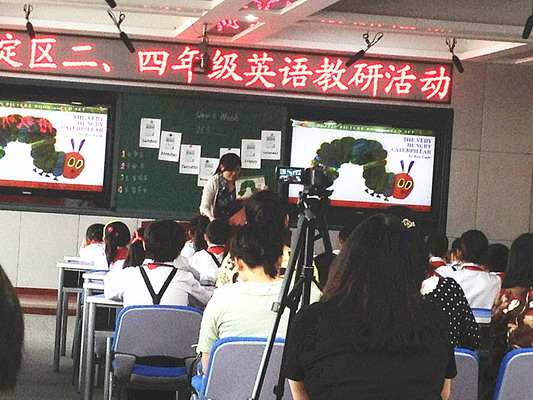 本次教研活动中,有两位老师分别进行了二年级和四年级内容讲解。第一堂课老师讲的是《Unit6 Week》,她通过向学生们展示日历图片,来引出所要讲的星期名字,并进行了分组,各组之间进行比赛,学生们学习热情很高,同时回答问题也非常积极踊跃;整堂课通过反复操练的方式,让学生们的口语表达能力得到了锻炼和提高,同时,也提升了学生们学习英语的兴趣和积极性。