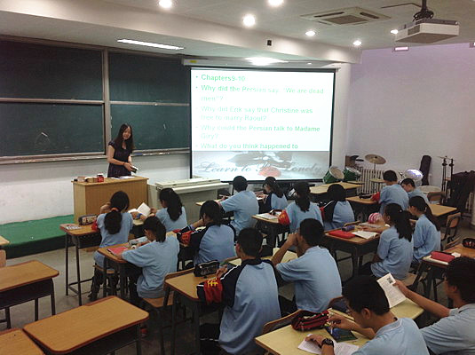 初一年级的陈莹老师带领同学们从细节入手,回忆《The Phantom of the Opera》(歌剧魅影)的各部情节,然后与学生共同探讨小说的结构,划分了故事的开端、发展、高潮和结尾。先后三位学生上台,结合各自的PPT,展示了自己的阅读感受,以及阅读中的好词好句等收获。陈老师接着一位同学的展示,谈到文学中的三种常见的修辞手法(明喻、暗喻和拟人),让学生对文学赏析有了进一步的了解。最后的趣味性写作作业更是体现激发学生英语阅读的兴趣和发散学生英语思维的目的。