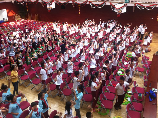 五年级各个班学生经过一个多月的精心准备,争分夺秒地苦练唱功,个个精神抖擞,着装整齐地排着队伍向国瑞厅走去。一路上他们议论纷纷,讨论着哪个班能在这次比赛中名列前茅,赛出水平。