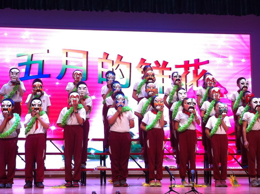 比赛中,有的班级学生统一穿着印有自己班级数字的T恤衫,虽然没有太多的花样,却以沉稳、端庄、大气的台风和过硬、自然、浑厚的唱功赢得了场下观众热烈的掌声;有的班级男同学如青松一样傲然挺立在台上,而女同学却如依人的小鸟在舞台中间翩翩起舞,让人无不发出啧啧赞叹之声;有的班级竟然唱着唱着,突然从身后拿出了人人喜爱的各种脸谱,不仅字正腔圆地唱出了古典艺术之美,更唱出了中华民族五千年丰厚的文化底蕴,让每一位在场的观众最后都情不自禁地跟着高歌起来;最让人喜欢的是五(3)班演唱的那首家喻户晓,人人皆知的《童年》这首歌曲,孩子们手中拿着自己喜欢玩的篮球,风车,羽毛球拍,弹着心爱的吉他,漫游在自己童话的世界里,他们幸福的表情,稚嫩的童声,调动了在场所有人的热情,也一起跟着吹起了口哨,回忆起了童年……