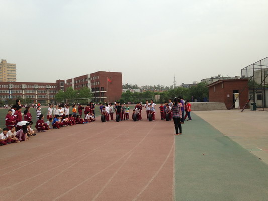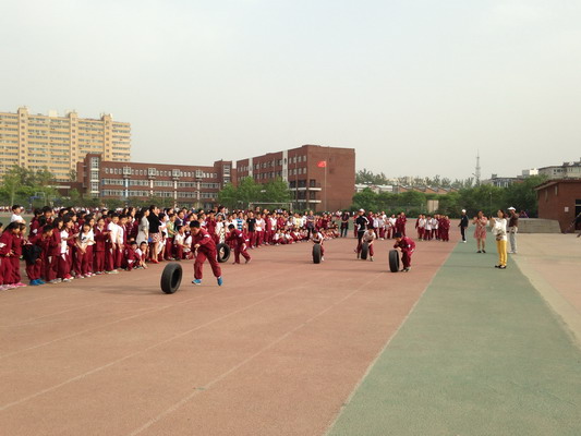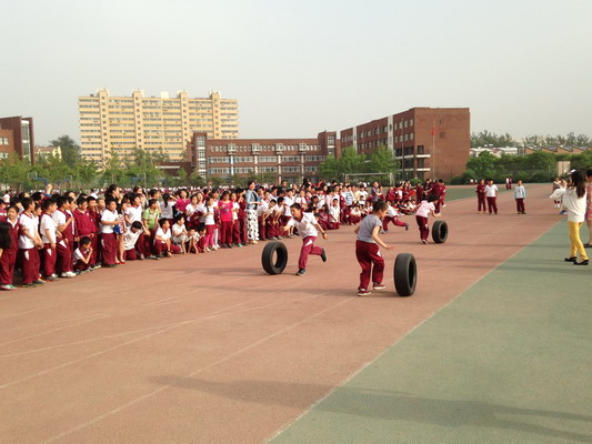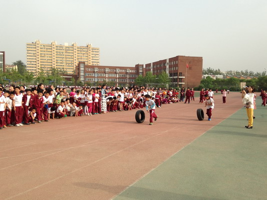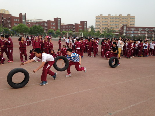 赛前,各班选出10名选手,整齐地站在班级队伍前面。李骏老师首先解读比赛规则:男女生各5名选手分别站在跑道两侧进行滚车轮接力赛,赛程为20米,用时最短者获胜。比赛开始,同学们精神抖擞地站在跑道上,他们摩拳擦掌,信心百倍。哨声响起,小选手们用尽全力而又小心翼翼滚动车轮,车轮像淘气的孩子,左摇右摆,同学们灵活地变换线路......比他们还紧张的是场下的老师和啦啦队,他们用尽全力呐喊助威,加油声此起彼伏,那火热的场面让人热血沸腾。夕阳暖暖地照着孩子们灿烂的笑脸,校园里留下一串串清脆的笑声。