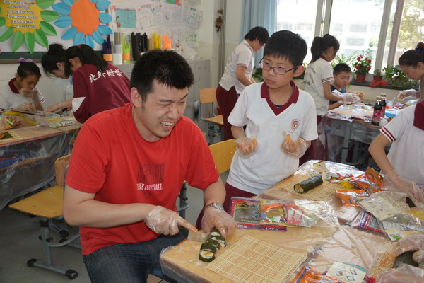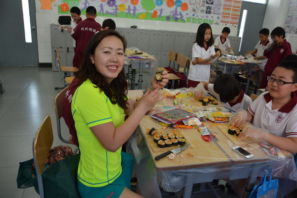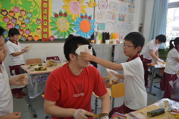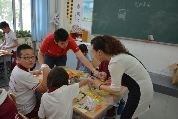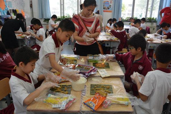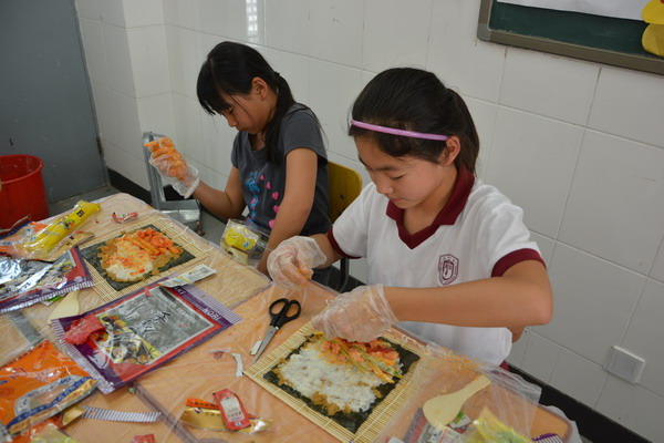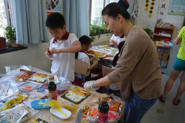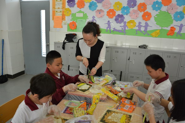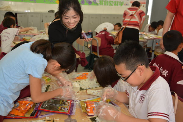 为了让学生在实践中进行学习,郭老师设计了一堂既经济实惠又能够让同学们学习到营养健康知识的 “自制寿司”实践活动课。做寿司的材料由班主任许老师和家长协商后统一为同学们购买,而米饭在学校食堂统一煮好再送到班里,保证米饭的用量和温度。班主任许老师邀请了部分家长参与了这次的实践活动,一切准备就绪,孩子们的情绪十分激昂,自发的分成多个活动小组,互帮互助一起动手动脑,全场人人有事做,个个全心投入,忙得不亦乐乎,家长们一个个也身怀绝技,穿梭在孩子们中间指导着,全场的老师、家长和孩子都沉浸在探究制作寿司的快乐中。每个孩子都努力完成了自己想象中最好吃的寿司,成功的喜悦写满在每个孩子的脸上。一节课下来同学们都收获满满的,大都学会了包卷寿司,并充分感受到活动的乐趣。