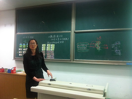 苑文娟老师就整个教学背景做了充分的介绍,在四年级全体数学教师的共同努力下,特别是张立新主任的亲自指导,许晓丹老师几次修改教案,并精心准备了大量的教具,教学过程活泼有趣、学生参与热情高,给老师们展示了一节高水平的教研课。在课堂上,许老师充分利用学生的生活经验和已有的知识,引导学生自主探索小数除法的计算方法和算理的理解:把知识的探索过程放手交给学生,学生通过自己动手,小组讨论,最后课堂展示记录的过程,从而把具体的数学教学情境转化为抽象的数学规律,使学生体会到小数除法在实际中的应用,激发了学生浓厚的数学学习兴趣。