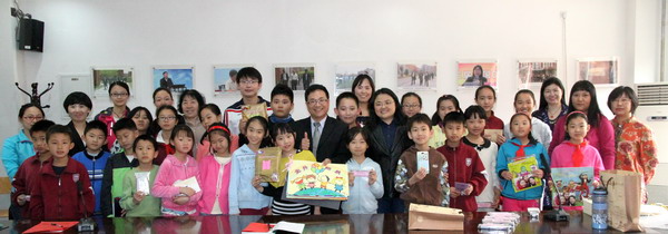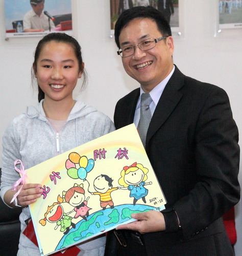 张校长不远万里,捎来了台湾家庭给每一个孩子的精致礼物,并替台湾父母逐一拥抱亲吻了他们大陆的儿女,场面极其感人和温馨。我校的学生代表也将亲手画满真情的图册赠给了张校长。