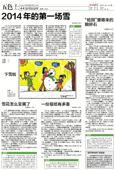 《北京晚报》五色土栏目刊登了我校初三六班学生关尔佳同学的作文《2014年的第一场雪》。