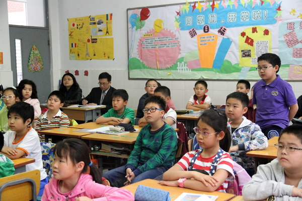 4月16日上午,台湾新北市昌平国小张信务校长走进我校四年级(6)班,听了赵阳老师的《图形中的规律》一节课,我校副校长于苒及四年级全体数学老师参与听课。