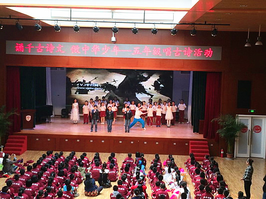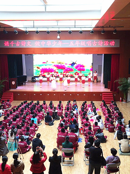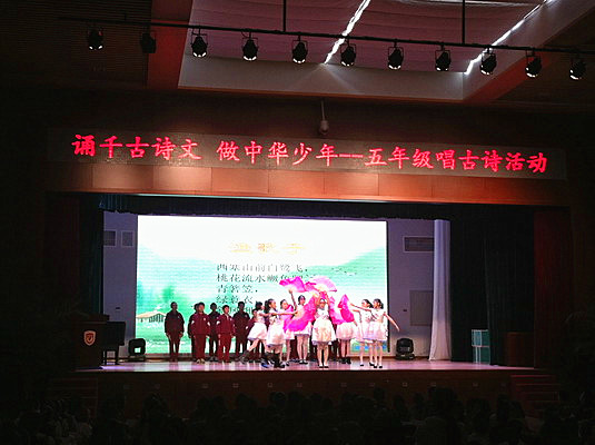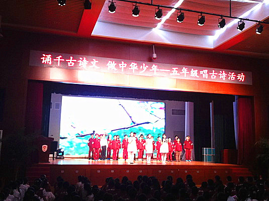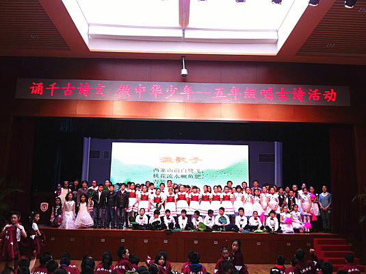 一个小时的活动进行得精彩纷呈。比赛形式多样,舞枪弄棍的英姿少年表演得有模有样;情景剧《静夜思》小李白一步一态仿佛把我们带回了唐朝;萨克斯演奏伴唱的《赋得古原草送别》低婉悠长;歌唱加伴舞《渔歌子》、《小池》,还有顽皮喜感的《元日》……同学们精彩、出色的表现赢得了在场师生和家长代表们的阵阵掌声。活动结束后,赵主任对孩子们的付出和对古诗的热爱表示赞扬,同时也感谢老师和家长们的支持,还特别感谢并介绍了《古诗新唱》的作者谷建芬老师,感谢她为孩子们作出了这么优美的曲子,每提到一首名曲,赵主任还吟唱几句,最后她希望孩子们能一代一代地传唱下去。孩子们在聆听后表示谨记在心,会把传诵中华古诗作为一种习惯,代代诵传。