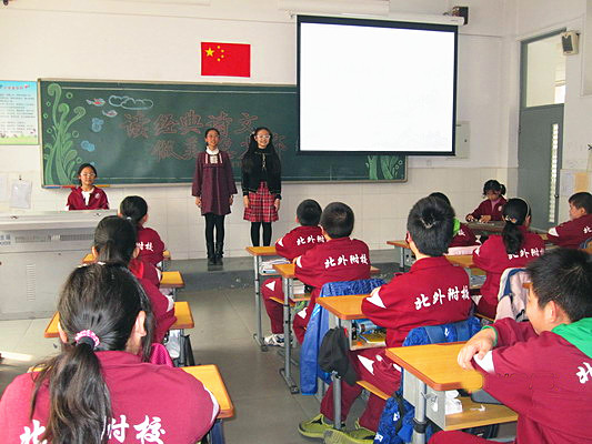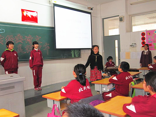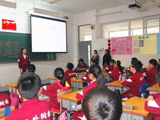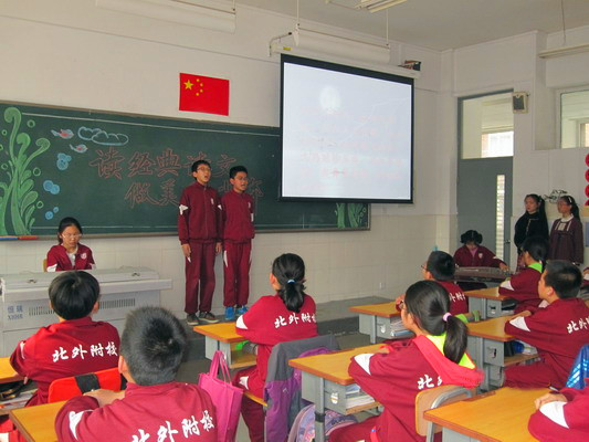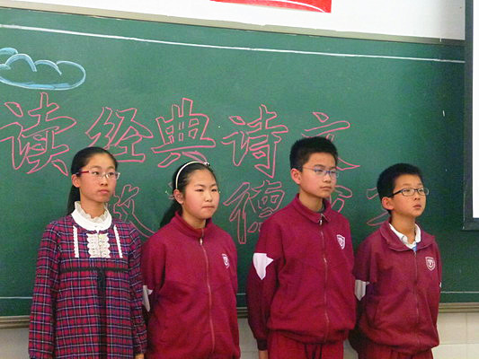 3月25日下午,小学六年级(7)班在刘砚茹老师的指导下,开展了“读经典诗文,做美德少年”朗诵活动。年级组长易知非老师和年级组语文老师到现场观摩。