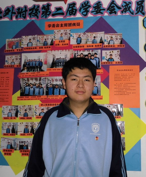 柯殷泽同学是个稳重、开朗的学生。他酷爱化学,虽然今年才上初二,却已经掌握了初三的内容,并在2013年的科技节上展示实验,博得了大家的一致好评。