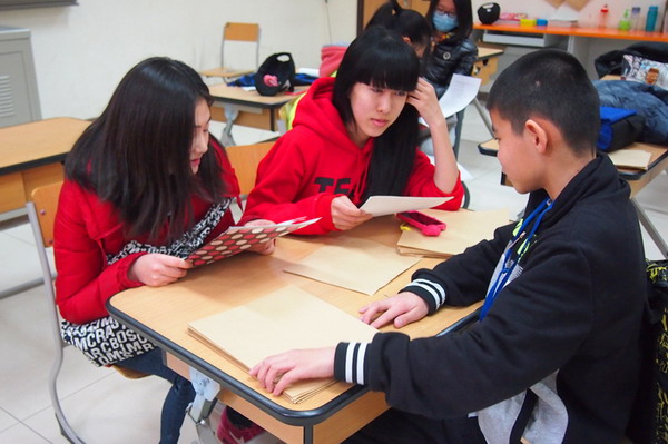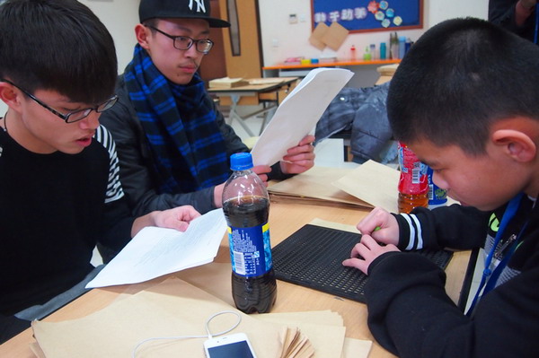 辅导结束后,我们和他聊天。惊叹于他的英语水平之余我们也表现出对盲文的好奇。于是他开始教我们如何写盲文。他告诉我们他不到一年的时间就学会了盲文,更是让我们敬佩不已。