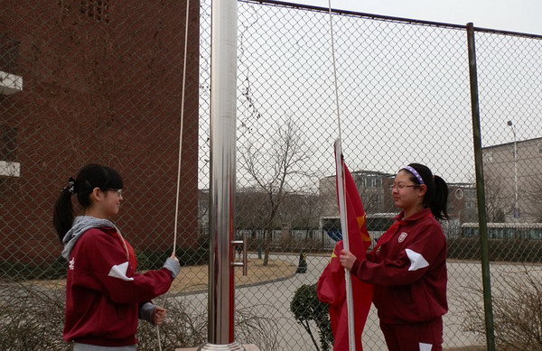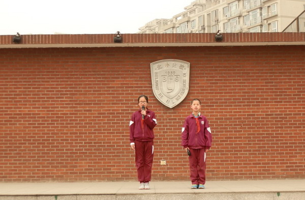 伴着雄壮激昂的义勇军进行曲,全体少先队员庄严地举起右手,向国旗敬礼。鲜艳的五星红旗在晨曦的第一缕阳光中再一次冉冉升起在我校的上空。