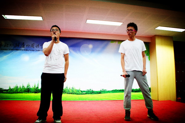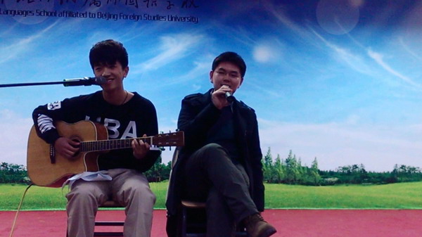 最后一天,高二年级二位同学带来的美国乡村音乐的说唱歌曲带动了整场的气氛,高二1班的闫一铭与团委张琳丰老师合奏弹唱了一曲《青城山下白素贞》,歌曲悠扬幽默,传达出我校师生之间的浓浓情义。