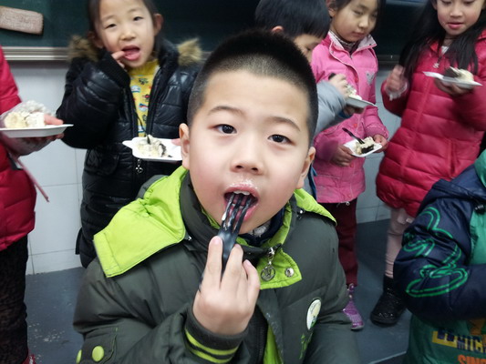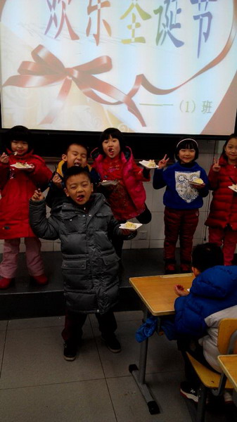 这是一年级新生在学校过得第一个圣诞节,家长们给孩子们带来了蛋糕,礼物,老师们准备了很多小零食并设计了很多游戏环节,有个性表演,击鼓传花,猜谜语,切蛋糕,给爸爸妈妈唱圣诞歌等,并利用微信在微信群里给爸爸妈妈送去了祝福:“祝爸爸妈妈圣诞节快乐,我们在学校很开心”……
