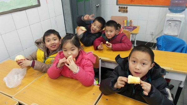 活动初始,伴随着欢快的圣诞歌曲,在刘老师的帮助下,全班的小朋友们一起分享了带着家长和老师殷殷祝福的“平安果”,希望孩子们平安健康。