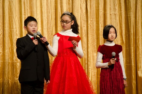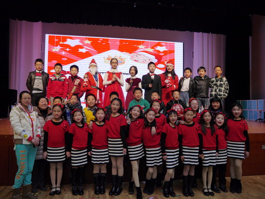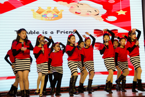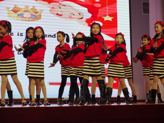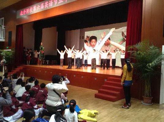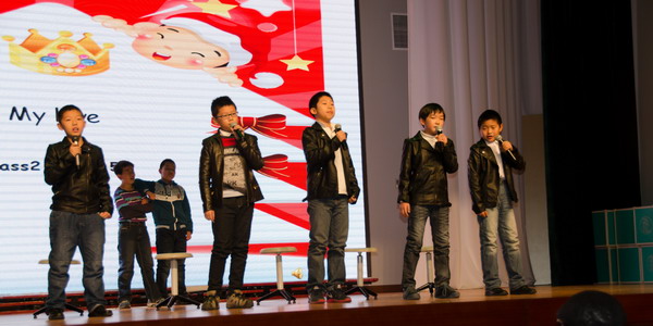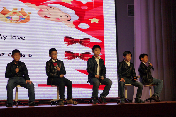 每一个孩子在此时此刻都远离了课堂的严肃,作业的压力,考试的烦恼。每一个孩子都安静而有序地席地而坐,欣赏着一个又一个精彩生动的节目。有《Trouble is a Friend》这样热情似火的女生集体歌舞,有《My Love》这样由一群小绅士联手表演的抒情歌曲,也有《Silent Night》这样“文艺范儿”十足的歌曲联唱,还有《The Fox》这样地道“爵士味儿”的歌舞表演。这些节目都是老师孩子们利用课余时间自编自导自演,经过五年级全体孩子,全体英语老师,以及全体家长的共同努力,呈现出一场专业的联欢演出!