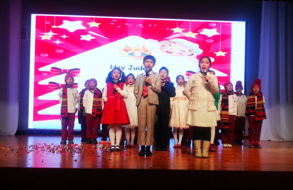 12月25日下午,孩子们期盼已久的圣诞夜英语节歌曲狂欢终于拉开了帷幕,小学五年级在国瑞厅举行了英语月歌曲大赛及圣诞夜联欢会,五年级全体师生参加了本次活动。