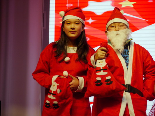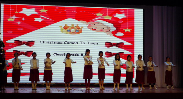 最后出现的神秘而有趣的圣诞老人和圣诞小女孩让活动进入一个新的高潮。当主持人高呼“A big surprise”之后,圣诞老人扛着一大袋糖果出现在舞台中央,全体学生终于按捺不住心中的激动和狂喜,涌向舞台,争先恐后地向圣诞老人要糖果,并和圣诞老人合影。到场的数位家长也是笑得合不拢嘴,连连称赞,说这个圣诞节真是让他们大开眼界。