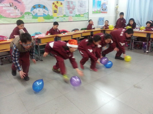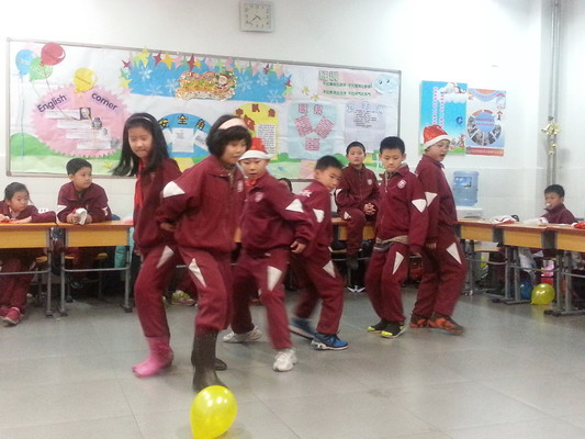 班主任赵阳老师和英语田兆老师一起参加了这次Party。田老师给大家讲了圣诞节的由来,圣诞节的传统,同学们的热情非常高涨。然后,赵老师带着大家玩了“头顶球” 、“推车”、“运炸弹”等游戏,决出一二三等奖。获得奖励的同学都可以到班级精心布置的圣诞树上寻找奖品,孩子们看着挂满奖品的圣诞树,都跃跃欲试,争取取得好成绩!