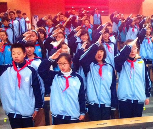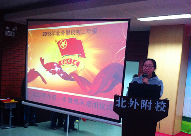 2013年12月5日下午,我校初二年级277名师生在第二阶梯教室集会,为全体初二年级同学举行2013年北外附校“迈好青春第一步”暨退队建团活动。