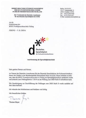 12月6日,德国国外学校教育司督导Spiegel 女士来我校进行德语考试等级C1资格授予仪式。我校成为全国范围内拥有德语C1考试资质学校之一。