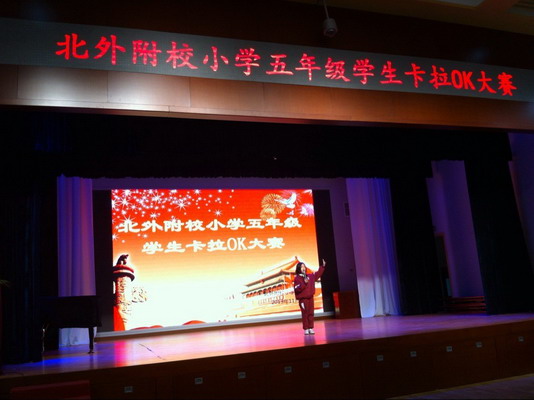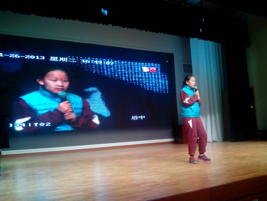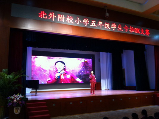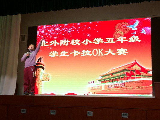 孩子们在老师的带领下,安静步入会场,席地坐在温暖的木地板上,仿佛来到了音乐的盛殿。LED大屏上打出了“五年级卡拉OK大赛”的字样,学生兴奋的眼神显露无疑。随着年级组长王宇老师宣布比赛正式开始,全场报以雷鸣般的掌声,选手依次登台献艺。堪称专业歌手的陈和杉、帅丹妮,刚一亮出金嗓子,便让老师们的闪光灯频频闪烁。林凯俊同学的英文歌曲深情款款,把小外交家的气度风采展现得淋漓尽致。新疆女孩王雅婷的蒙古长调悠扬婉转、余音绕梁,不觉国瑞厅门外一角缝隙处多了个身影,原来是外教老师被这天籁之音所逗引,情不自禁的停住了脚步探深窥望,用英式中文大赞“好听!”