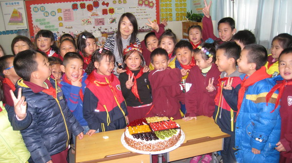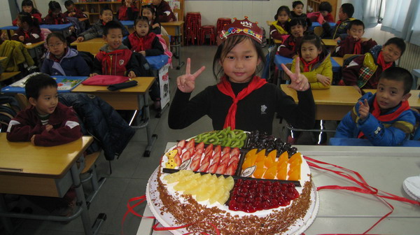 今天是二年级(9)班王雨桐同学的生日,借过生日之际,班主任周继娜对同学们进行感恩的教育。把生日蛋糕切开之前,王雨桐动情地说:“我最想感谢的是爸爸、妈妈”,“ 还有教过我的所有老师。”接着在老师的组织下,同学们围拢过来,与过生日的“小福星”王雨桐合影,体现班集体的友爱、温暖。相信在(9)班班主任“生活皆教育”理念引导下,感恩的种子会在班级生根开花。
