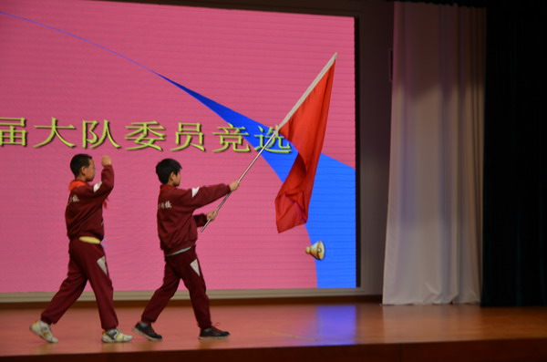 “出旗、敬礼”随着鲜艳的大队旗绕场一周,新一届大队委员竞选在国瑞厅拉开了序幕。从上周开始向全校四至六年级所有少先队员进行宣传动员工作,并由各年级组和各中队进行了班级初选,推荐出的46名大队委员候选人,今天在活动现场进行了竞选演说。