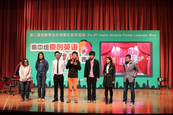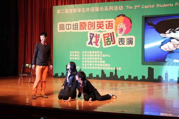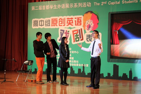 2013年10月,在“第二届首都学生外语展示系列活动之高中组原创校园英文短剧”比赛中,我校高中英语戏剧社选送的原创英语短剧《A Dream》,经过初赛的严格筛选,成功晋级决赛,并在决赛中进入前10名,荣获二等奖。高二1班蔡宗伯同学凭借精湛演技获得最佳男配角。这是我校继2012年获奖之后再次获得团体第二名的好成绩。