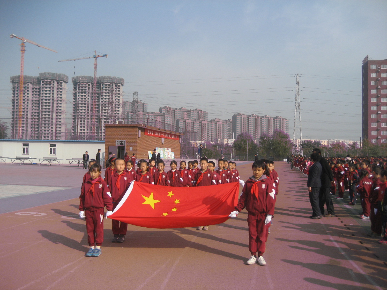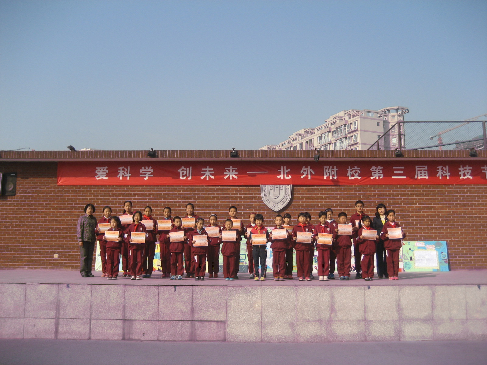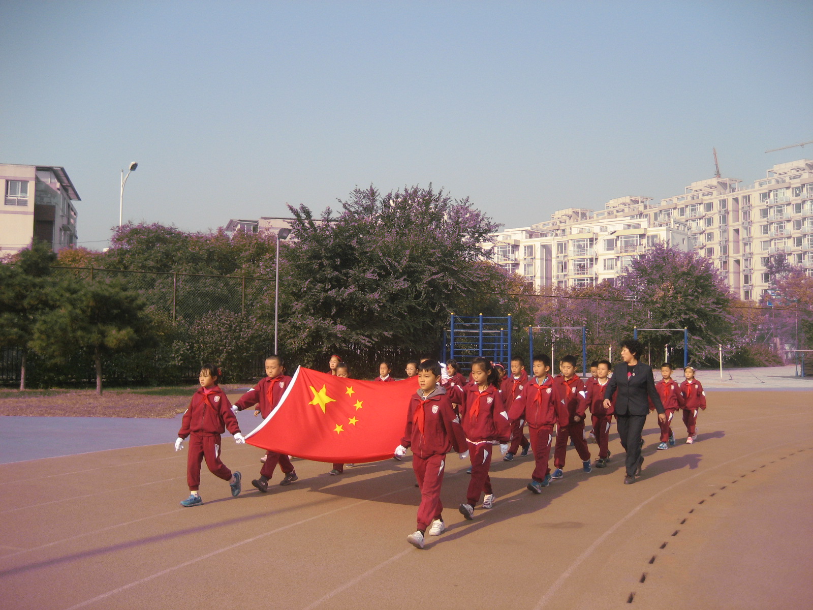 2013年10月21日上午北外附校小学部举行了第九周升旗仪式。校长助理常务副主任赵玉玲、德育部副主任李明明及全体小学部师生出席了本次升旗仪式。本周升旗班级为三年级五班。升旗仪式上,三年级组黄玉卿老师进行了国旗下讲话:黄老师带领三年级五班全体同学在国旗下集体诗朗诵“我的祖国”,抒发了同学们的爱国情怀。接着大队辅导员杨安来老师宣布了获得第八周文明示范班和卫生示范班的班级名单,北外附校校长助理,小学部副主任赵玉玲和德育处副主任李明明为获奖班级颁奖并合影留念。