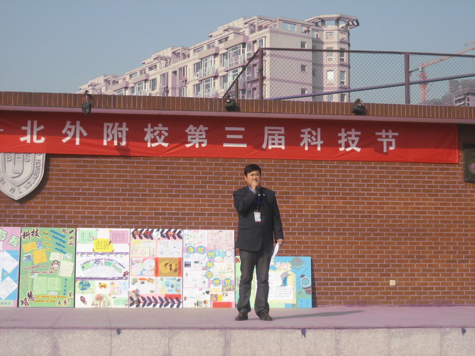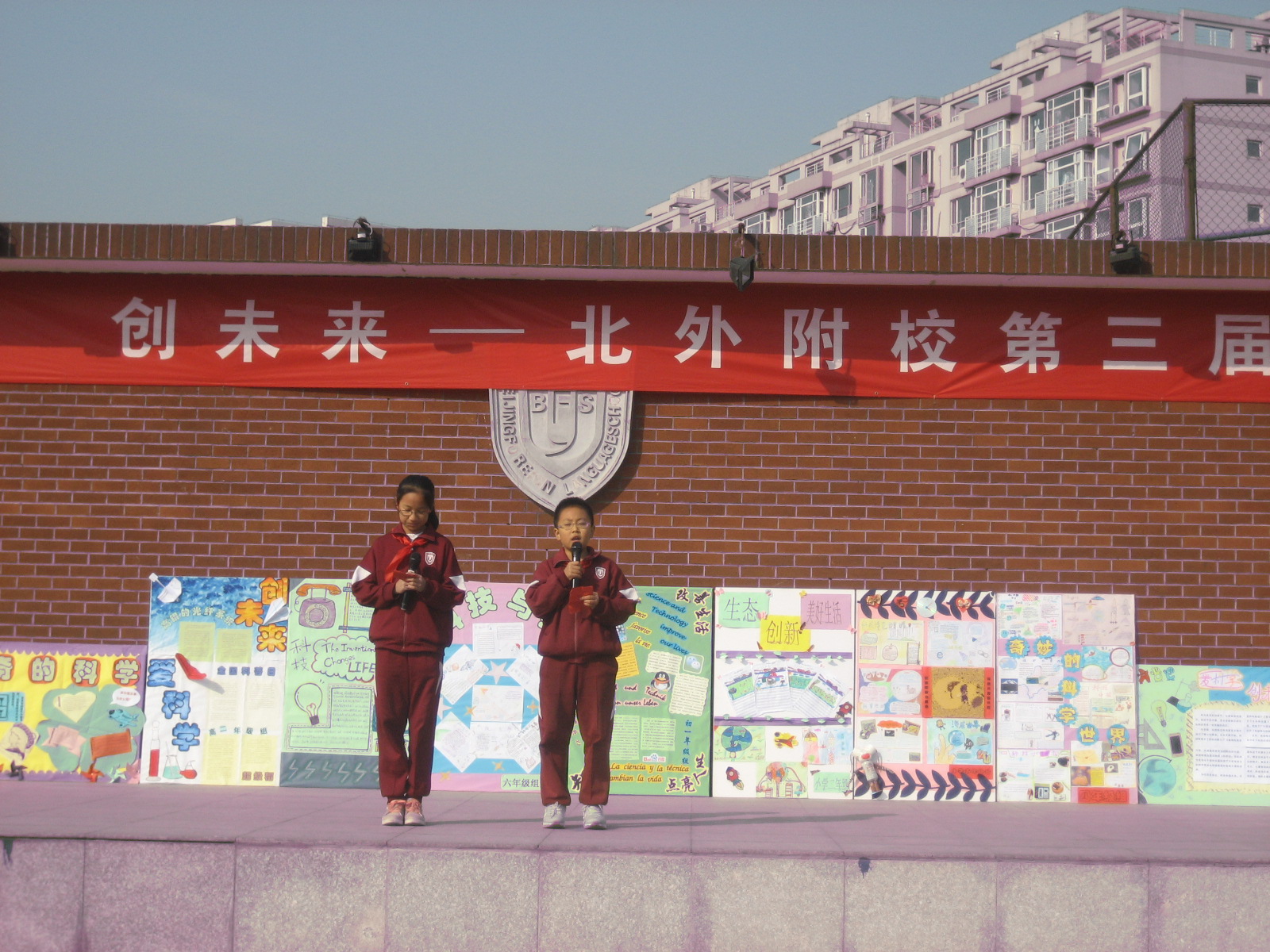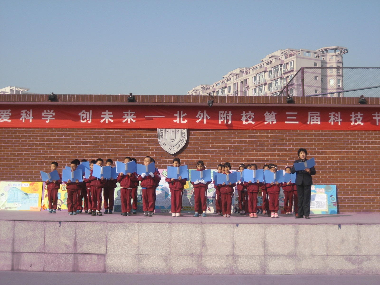 2013年10月21日上午北外附校小学部举行了第九周升旗仪式。校长助理常务副主任赵玉玲、德育部副主任李明明及全体小学部师生出席了本次升旗仪式。本周升旗班级为三年级五班。升旗仪式上,三年级组黄玉卿老师进行了国旗下讲话:黄老师带领三年级五班全体同学在国旗下集体诗朗诵“我的祖国”,抒发了同学们的爱国情怀。接着大队辅导员杨安来老师宣布了获得第八周文明示范班和卫生示范班的班级名单,北外附校校长助理,小学部副主任赵玉玲和德育处副主任李明明为获奖班级颁奖并合影留念。