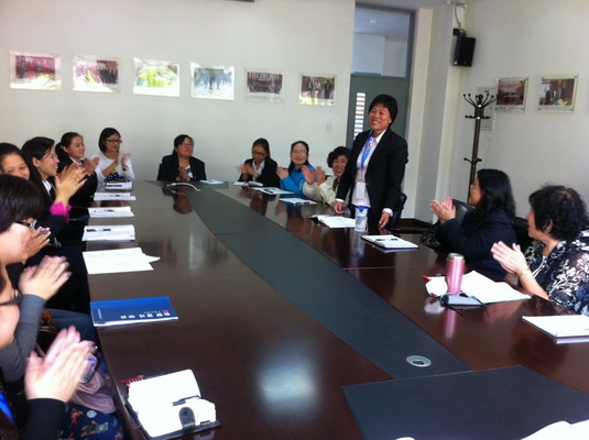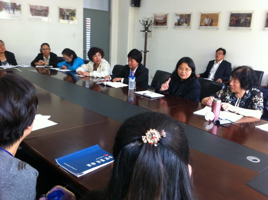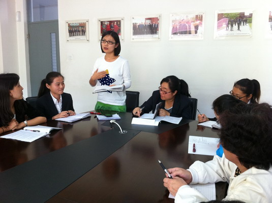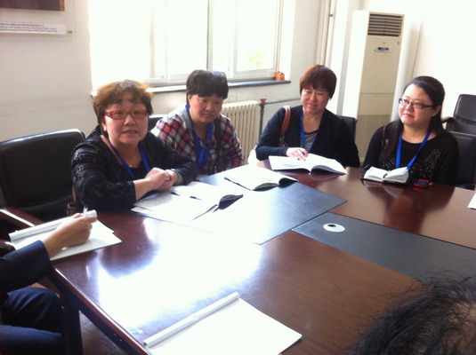 首先由数学、语文、英语学科的三位教研组长介绍本学科常态化的备课、上课、研讨工作,也就本学科的特色之处全盘地介绍给谈固校的老师们。英语教研组长张亚妹老师对英语课型的分配了如指掌,一节歌曲、两节句型、一节拓展应用、一节听力、一节写作、两节范读、一节复习的巧妙安排让对方的老师大开眼界,认真记录生怕遗漏。
