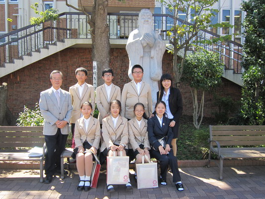 9月28日上午,我校代表团来到樱美林大学,受到了樱美林初高中的上级单位樱美林学园理事长佐藤东洋士先生的接见。佐藤理事长首先欢迎我们来到日本,并转达了中国驻日本大使馆公使衔参赞白刚先生对我校来访的关切和问候。季主任感谢佐藤理事长对我校来访的盛情接待,并转达了林校长对于佐藤理事长和白刚先生的问候。随后,在理事长办公室志村部长的亲自引导下,我校师生参观了樱美林大学的校园、校史博物馆等,学习了樱美林与中国的友好交流史,并与校园内的孔子像及樱美林创始人清水安三先生铜像合影留念。