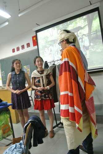 高二同学表演的是买卖衣服的场景,在三个西语班中,他们的年级最高,但人数也最少。他们三个人完美的表演了这个话剧,赢得了满堂喝彩。