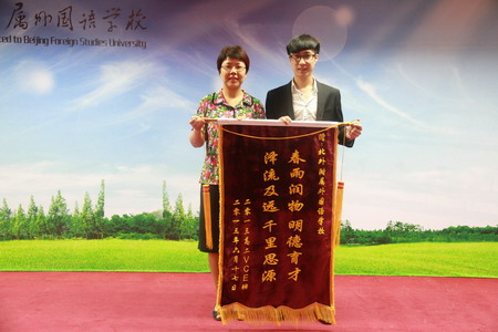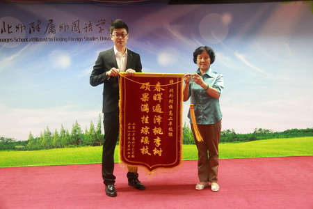 在庄严肃穆的国歌声中,毕业典礼拉开了帷幕。首先,高二VCE班级向学校、高二年级组各赠送锦旗,同时高二年级组回赠学生最纪念意义的毕业照。王校长向毕业师生致辞,王校长深情地回顾了即将毕业的学生们两年的成长经历与辉煌,并代表学校表达了对令母校骄傲的老师们和学子们的诚挚感谢和美好祝愿。然后是学生家长代表史可父亲和孙旭彤父亲向学校致以最崇高的敬意和最诚挚的感谢,史可父亲说:“这两年,对于孩子来说,是一次美丽的蝶变。她的点点滴滴的进步,我们作为家长都看在眼里,喜在心头。今天的她,之所以能成为一个有理想、好学上进、明达事理、有感恩的心、有责任感的青年人,在这里面,北外附校起到非常重要的作用。在这个中国社会转型时期,中学教育问题频出的大环境中,我们当了两年舒心的家长,这当然要感谢北外附校。你们用事实证明了,我们两年前的选择是正确的。我衷心的希望,有更多的孩子能入读这样的好学校。感谢学校能够为家长们培养出如此优秀的孩子。”孙旭彤父亲说:“从2011年8月孩子入学到2013年今天孩子毕业,我想用最简单的两个词来形容,那就是从“忐忑”到 “欣慰”。因为最初入学时我不能确定北外附校是否适合我的孩子,学校的教学方式和师资力量是否能达到我的期望值;我们来自天津,远在异地的寄宿生活孩子能不能适应;从没有独自出门的她能不能与老师、同学们和睦相处……。然而令我欣慰的是,在北外附校的两年间,她不仅学习成绩有了很大的提高,而且在品德、素质、兴趣爱好等各方面都取得了实实在在的成绩,拓宽了视野、丰富了思想、增强了能力。既收获了成长的快乐,又经历了成长过程中必不可少的磨砺,为以后的人生积累了宝贵的财富。”