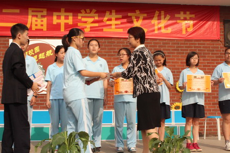 演出间歇,对在本届文化节中涌现的优秀集体和先进个人进行了集中表彰。初一(1)班等16个班级荣膺 “美丽班级”;男女生共有24个宿舍被评为“美丽宿舍”;另有在“校园之星”评比、“美境行动”设计方案、校园歌手大赛、征文演讲比赛等活动中表现突出的一大批先进典型。常务副校长王彤博士、副校长张继军、副校长副书记高雁鸣及德育处、教务处部门相关负责人分别为获奖集体和个人颁奖。
