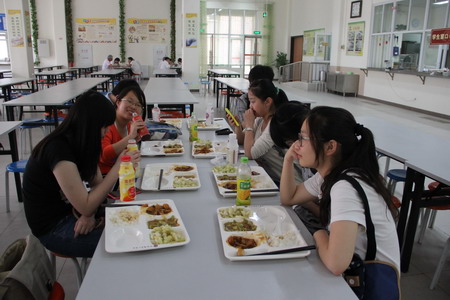 在大家完成支教后由于还要参与接待美国交流生的原因便直接在盲人学校用餐了。这里的食堂和我们的食堂不同,我们的食堂可以由我们自己选择自己喜欢的食物,而这里的却是由食堂工作人员配好每顿饭的内容,打饭给每个同学,但是这里的食堂的饭十分好吃,每个同学都吃的津津有味。只是在吃饭的时候,他们忘记了一个同学,使得那个同学内心经历了极大的创伤,希望日后社团的社长及其他的人可以给这个同学一些补偿。